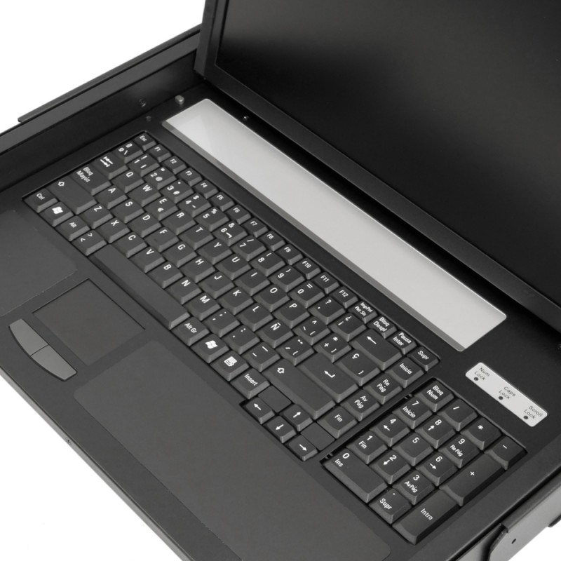 Kit de KVM (Teclado, ratón y monitor de 17") en formato de rack 19" y 1U de altura cuando está retraido. Fabricado en resistente metal de color negro. Dispositivo de rack 19" que se fija a los bastidores frontal y trasero del armario rack. En el frontal dispone de mangos para abrir el KVM, como un cajón, pues dispone de barras deslizantes con rodamientos de alta calidad. El monitor de 17" puede ser desplegado independientemente de que la guía esté retraida o extraida. Al desplegar el monitor quedan accesibles el teclado, el touchpad y controles de la consola.